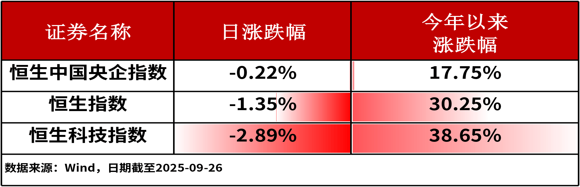 09月26日,A股三大股指全线下跌,上证指数收跌0.65%,深证成指收跌1.76%,创业板指收跌2.60%。主流宽基指数中,科创100指数下跌2.28%,跌幅相对较大。全市场仅1,800余只股票上涨。港股主流指数集体收跌。其中,恒生中国央企指数下跌0.22%,跌幅相对较小。沪深两市成交额为21469亿元人民币,相较上个交易日大幅缩量。