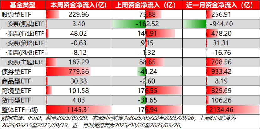 本周ETF市场整体呈现大额净流入态势,单周资金净流入超1145.31亿元,占近一月ETF市场资金净流入的一半以上,所有大类ETF均呈现资金净流入态势。其中,债券型ETF为流入主力,资金净流入达779.36亿元。股票型ETF与跨境型ETF资金净流入均超百亿,达229.96亿与101.58亿。这反映出上周ETF市场火热,资金布局具有风险分散的特征。