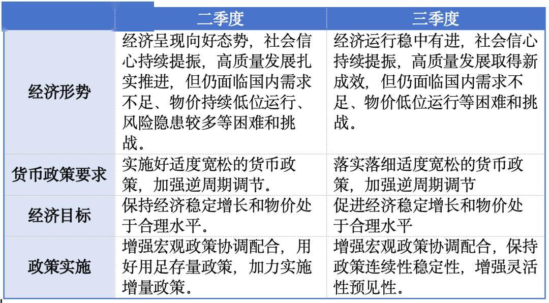 首先,经济形势判断趋稳,风险预期有所改善。三季度例会对国内经济的描述从二季度的“呈现向好态势”升级为“稳中有进”,同时明确提及“高质量发展取得新成效”。此外,二季度例会中“风险隐患较多”的表述在本次会议中未再出现,仅保留“国内需求不足、物价低位运行”的困难表述。
