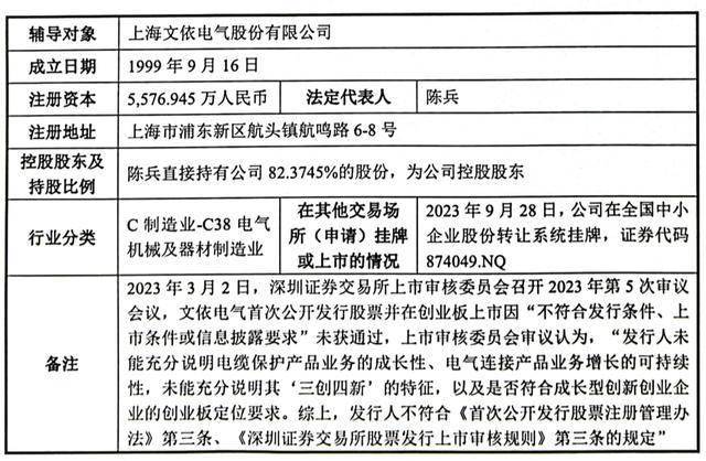 2023年3月,深交所上市委召开2023年第5次审议会议,文依电气创业板IPO因“不符合发行条件、上市条件或信息披露要求”未获通过。