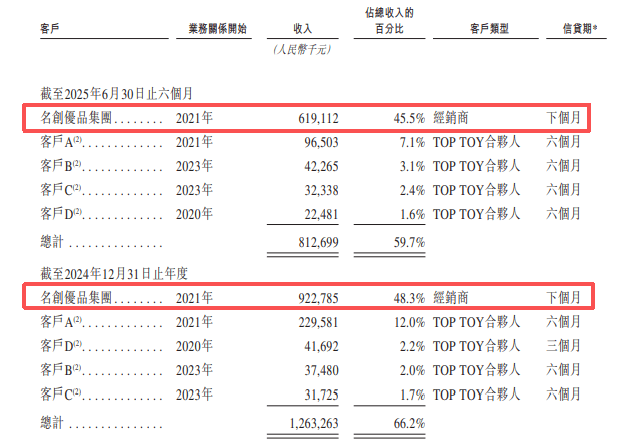 前五大客户贡献了TOP TOY主要收入,2022-2024年,前五客户收入贡献占比都超过了65%。2025年上半年,前五客户贡献营收8.1亿元,占比59.7%,占比已经是最低了。