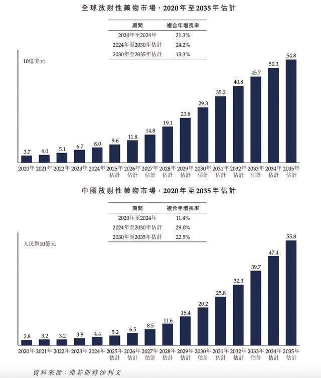 于2024年,全球放射性药物市场估值为80亿美元,预期于2030年将达到293亿美元,期间复合年增长率为24.2%。于2030年至2035年,预期市场将进一步扩大至548亿美元,复合年增长率为13.3%。于2024年,中国放射性药物市场估值为人民币44亿美元,预计于2030年将增长至人民币202亿元,同期复合年增长率为29.0%。预计市场将于2035年进一步达到人民币558亿元,于2030年至2035年按复合年增长率22.5%增长。下图分别载列于所示期间全球及中国放射性药物的市场规模。