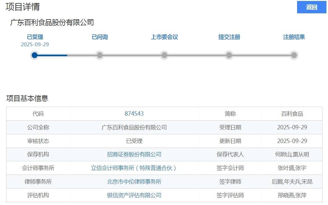 北交所公开发行并上市信息显示,9月29日,广东百利食品股份有限公司(以下简称“百利食品”)北交所IPO已获受理。