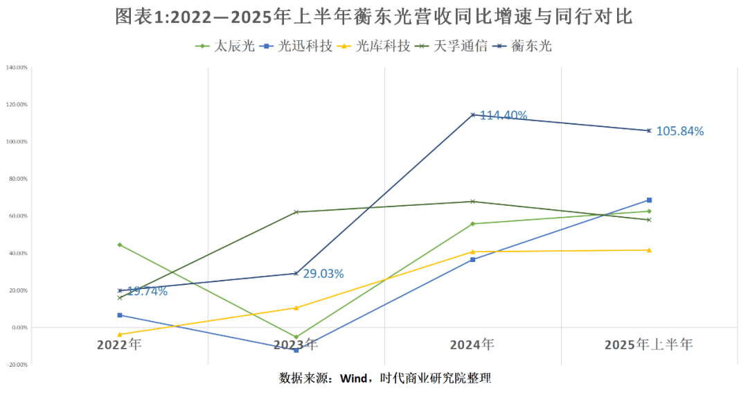 蘅东光将太辰光(300570.SZ)、光迅科技(002281.SZ)、光库科技(300620.SZ)、天孚通信(300394.SZ)列为同行可比公司。Wind数据显示,报告期各期,4家同行可比公司的营收同比增速均值分别为15.77%、13.75%、50.16%、57.63%,净利润同比增速均值分别为45.60%、4.20%、47.33%、68.49%,均低于蘅东光。从单个企业来看,2024—2025年上半年,蘅东光的营收和净利润同比增速均远超同行。