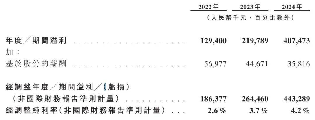 三只松鼠2022年、2023年、2024年经调整净利分别为1.86亿元、2.64亿元、4.43亿元;经调整净利率分别为2.6%、3.7%、4.2%。