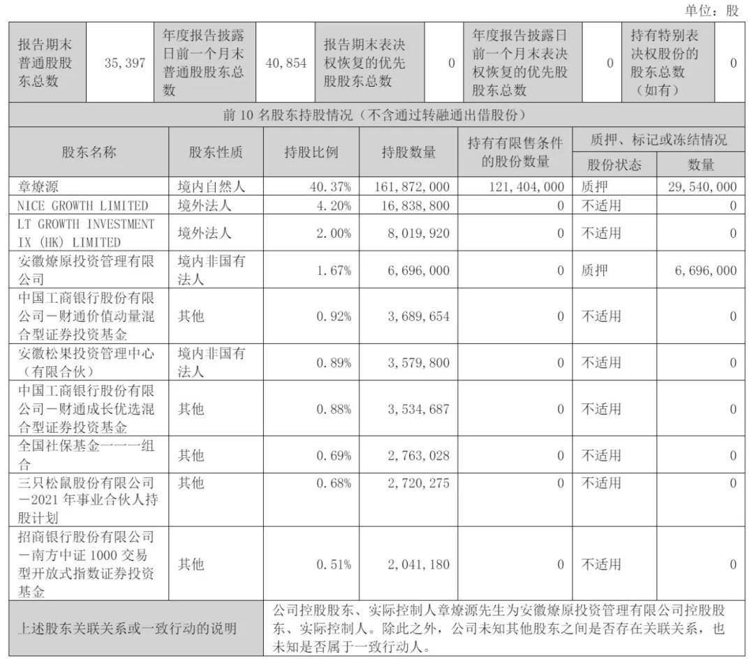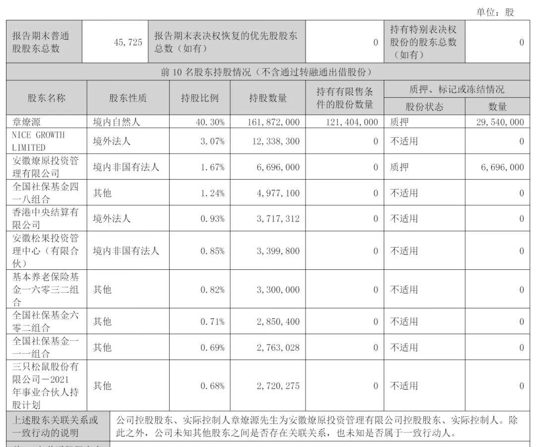 截至2025年6月30日,三只松鼠创始人、CEO章燎源持股40.3%,IDG资本旗下NICE GROWTH LIMITED持股3.07%,安徽燎原投资管理有限公司持股为1.67%,全国社保基金四一八组合持股为1.24%;