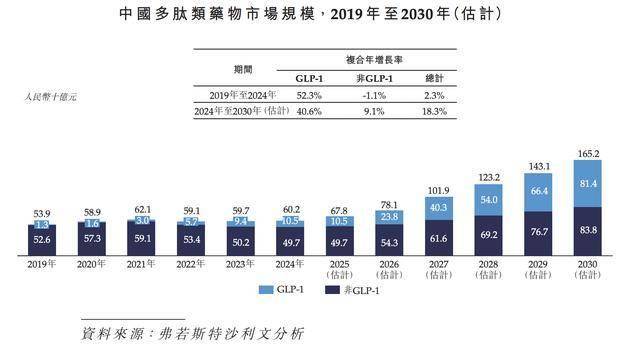 此外,得益于有利的政策、日益增长的治疗需求以及技术的革新与进步,中国多肽类药物市场已呈现加速增长趋势。中国多肽类药物市场由2019年的人民币539亿元增至2024年的人民币602亿元,复合年增长率为2.3%,并估计到2030年将达到人民币1,652亿元,2024年至2030年期间的复合年增长率为18.3%。