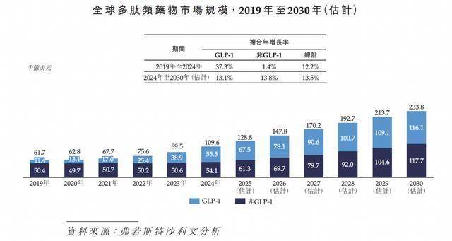 基于临床优势,多肽类药物的应用已深入渗透到多个关键治疗领域,并获得FDA及国家药监局等全球监管机构的广泛批准。全球多肽类药物市场由2019年的617亿美元增至2024年的1,096亿美元,复合年增长率为12.2%,并估计到2030年将达到2,338亿美元,复合年增长率为13.5%。