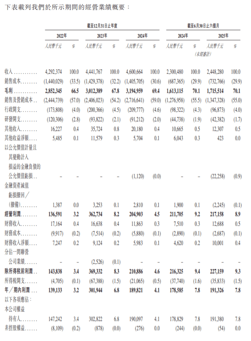 因此,自然堂控股的业绩也是蒸蒸日上。招股书显示,2022年、2023年、2024年以及2025年上半年,自然堂控股的收入分别为人民币42.92亿元、44.42亿元、46.01亿元、24.48亿元,净利润分别为人民币1.39亿元、3.02亿元、1.9亿元、1.91亿元。