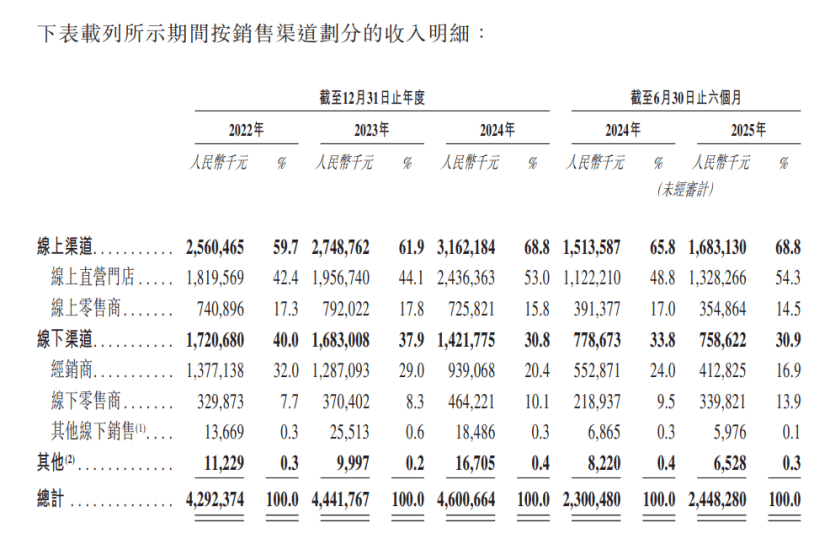 招股书显示,此前线上渠道一直是自然堂控股的核心渠道销售网络,2025年上半年,自然堂控股线上渠道的收入占比达到68.8%。但随着线上流量见顶,线下渠道愈发获得重视。