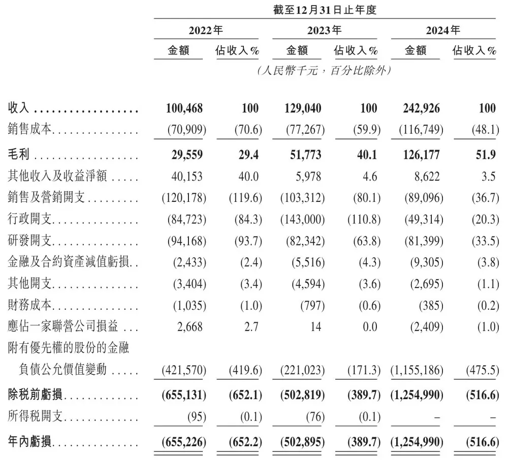 于2022年、2023年及2024年,滴普科技的研发费用分别为9420万元、8230万及8140万,分别占相关年度总收入的93.7%、63.8%及33.5%。