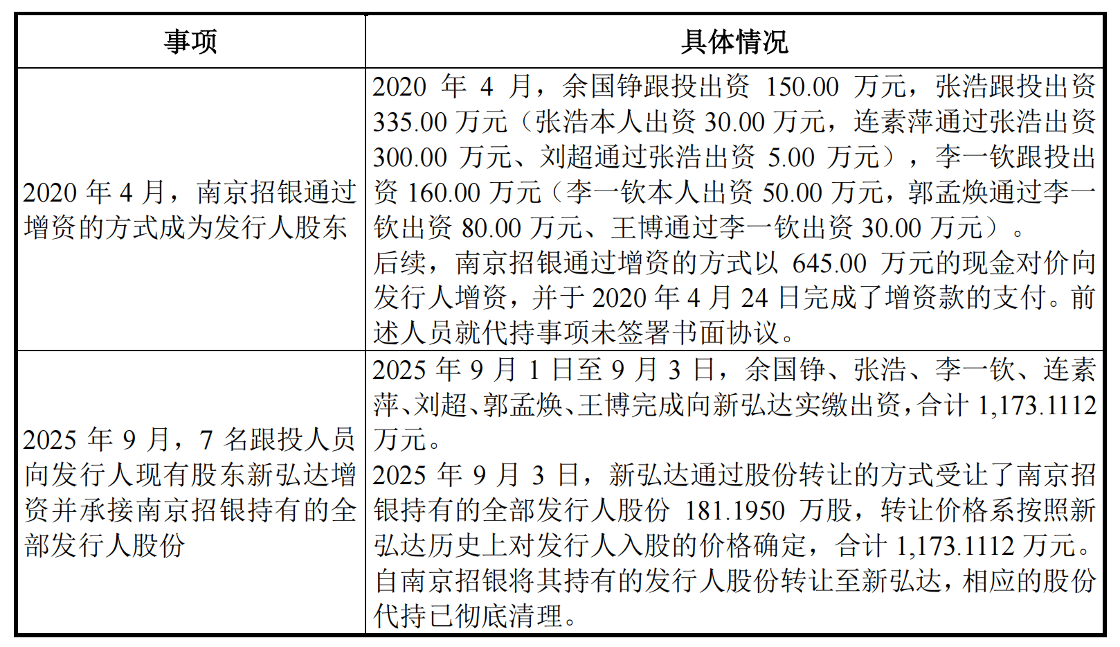2025年9月,7名跟投人员向公司现有股东新弘达增资并承接南京招银持有的全部公司股份。
