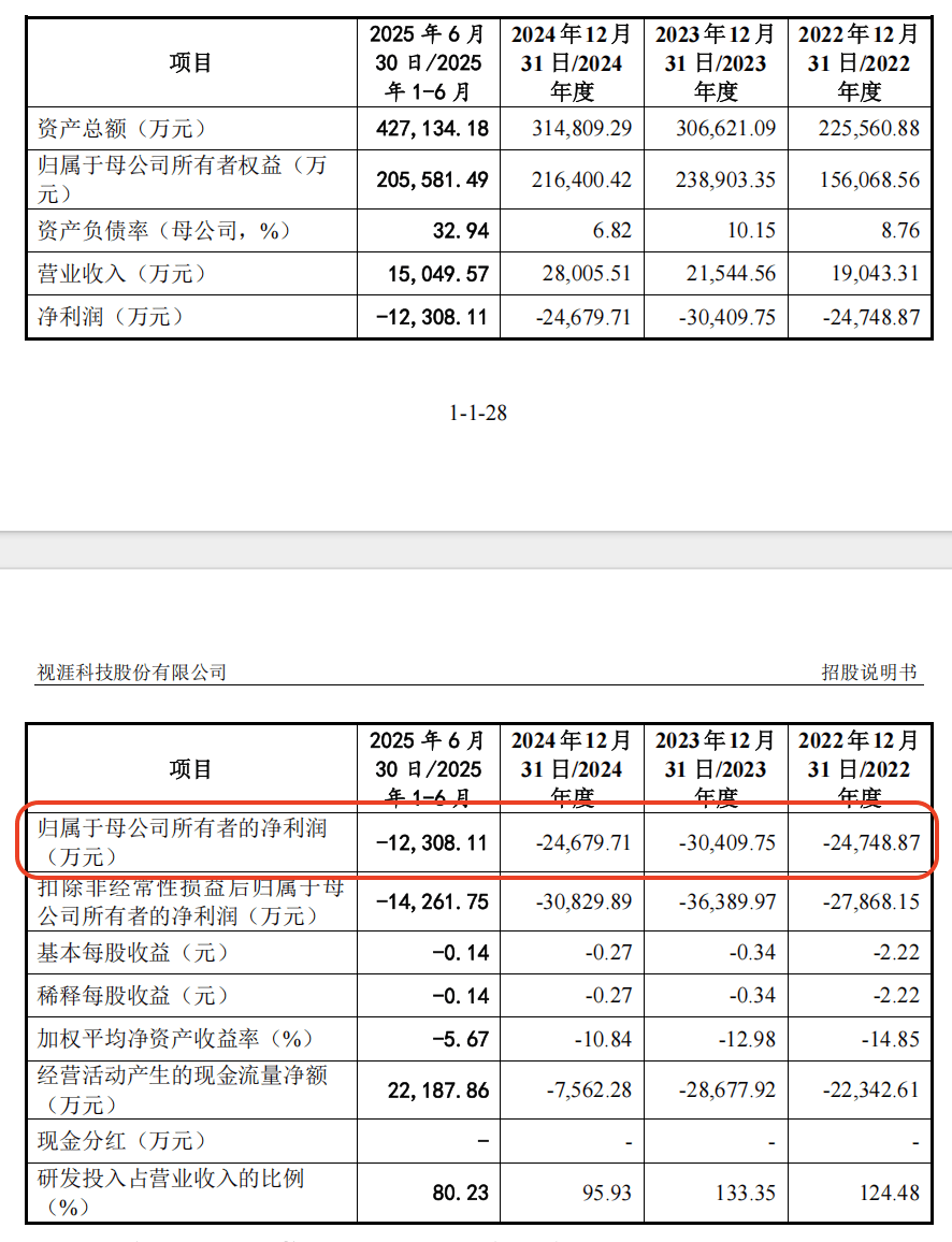 报告期(2022年~2025年上半年)各期,视涯科技分别实现营收约1.9亿元、2.15亿元、2.8亿元、1.5亿元,归母净利润-2.47亿元、-3.04亿元、-2.47亿元、-1.23亿元,3年半累计亏损约9.21亿元。