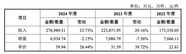 数据显示,在2022年至2024年间,其核心产品冲焊零部件的销量实际上是下降的,从7666.11万件减少到6934.74万件。但与此同时,这些零部件的平均销售单价却从每件22.61元近乎翻倍地涨到了39.94元。
