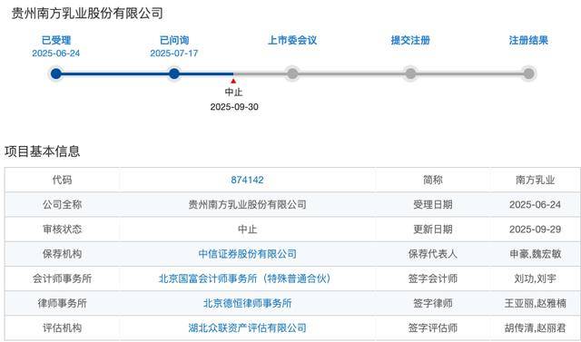 北交所上市申请审核动态显示,今年6月24日,南方乳业北交所IPO获受理,保荐机构为中信证券,会计师事务所为北京国富会计师事务所。