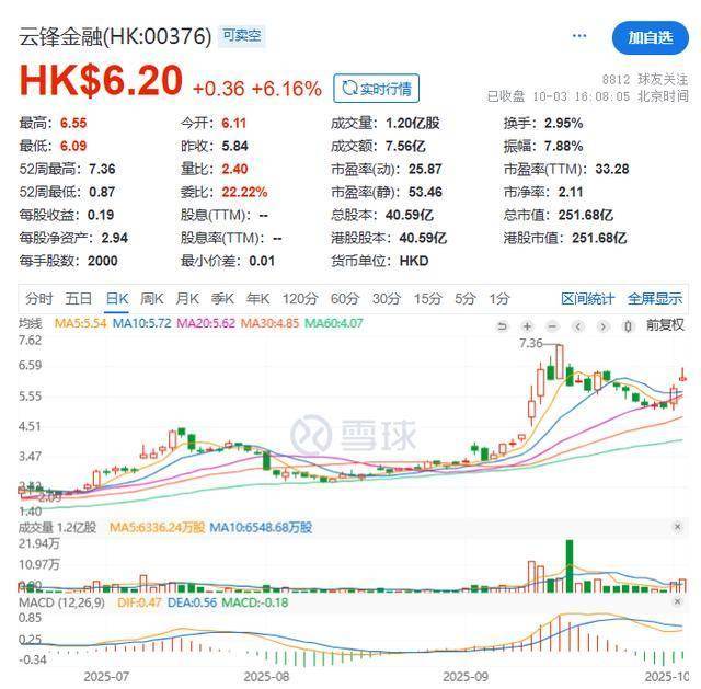 瑞财经 李兰10月3日,截至收盘,云锋金融(00376.HK)股价报6.2港元,涨6.16%。