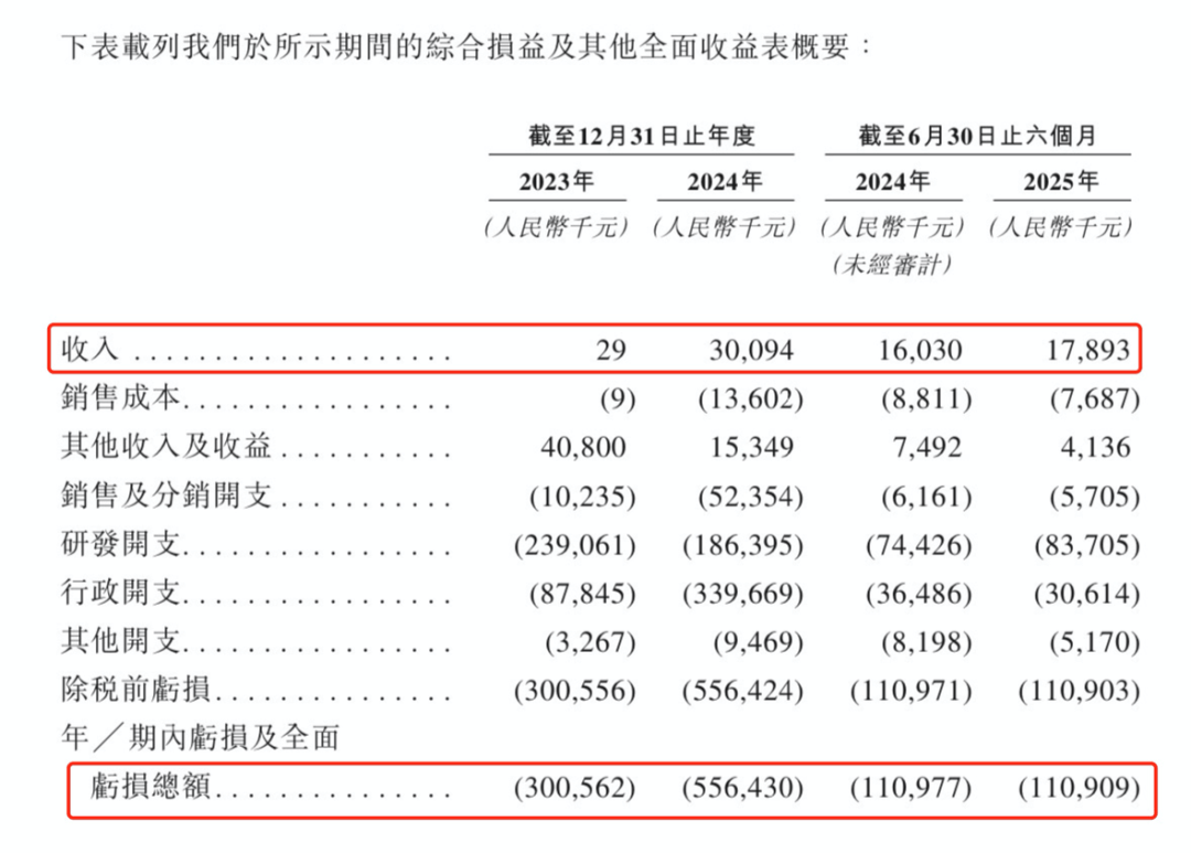 公司2023年、2024年和2025年前6个月的净亏损分别为3.01亿元、5.56亿元和1.11亿元人民币,两年半累计亏损已超过9亿元。亏损扩大的主要原因是,持续高额的研发投入,以及行政开支大幅增加(主要由于以股份为基础的薪酬支出增加)。