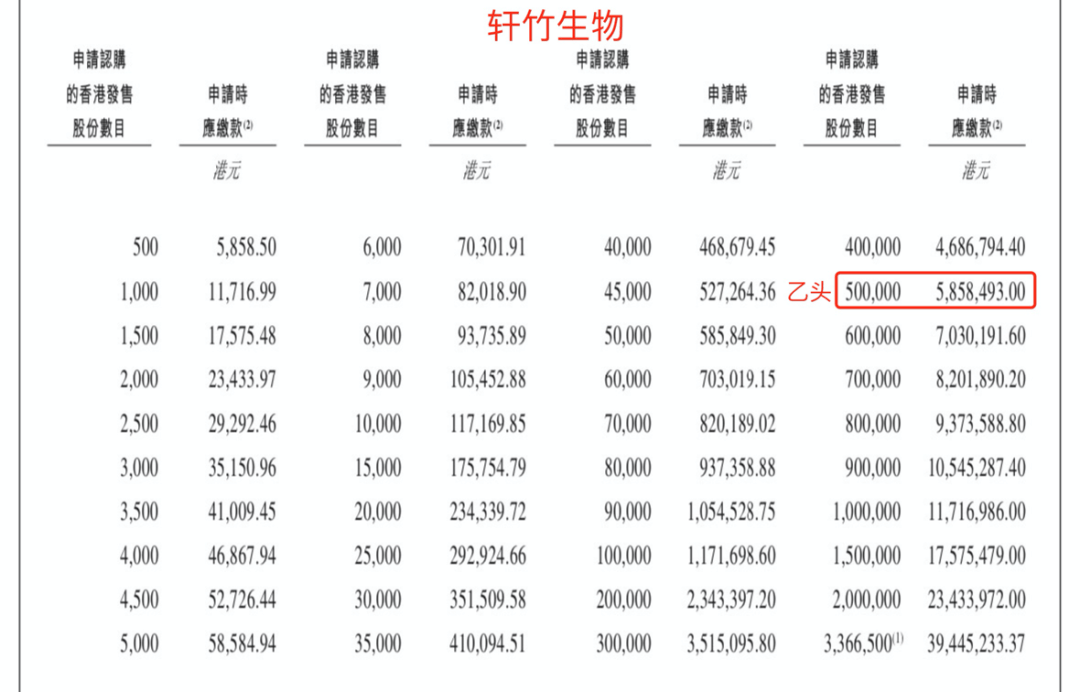 轩竹生物招股首日孖展150倍,最终大概率会超购3000倍,甲乙组各6733手。按照20万人申购算,预估一手中签率低于1%,甲组全员抽签。