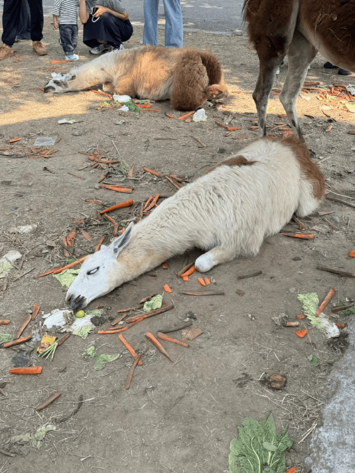 网帖图片显示,2只羊驼躺倒在地,眼神呆滞,四周散落着大量胡萝卜、白菜等食物残渣。有网友留言调侃:“它们真的吃不下了。”更有人晒图称,“带了五斤胡萝卜,扔了四斤。”也有人担心“动物这样吃会撑死”。还有网友质疑:“眼睛都翻白了,这不像是正常状态。”