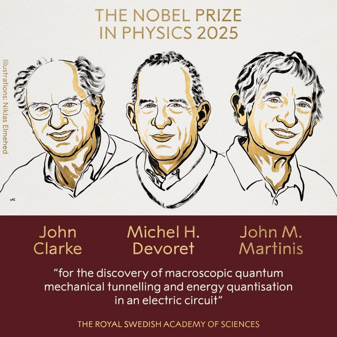 瑞典皇家科学院7日宣布,将2025年诺贝尔物理学奖授予约翰·克拉克 (John Clarke)、米歇尔·H·德沃雷特 (Michel H. Devoret) 和约翰·M·马丁尼斯 (John M. Martinis),以表彰他们“发现了电路中的宏观量子隧穿和能量量化”。