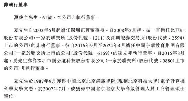 招股书显示,夏佐全,61岁,安诺优达非执行董事。自2008年3月起,一直担任比亚迪股份有限公司非执行董事。同时,夏佐全还担任深圳正轩董事长、
