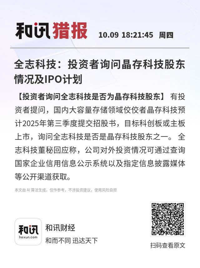 【投资者询问全志科技是否为晶存科技股东】有投资者提问,国内大容量存储领域佼佼者晶存科技预计2025年第三季度提交招股书,目标科创板或主板上市,询问全志科技是否是晶存科技股东之一。 全志科技董秘回应称,公司对外投资情况可通过查询国家企业信用信息公示系统以及指定信息披露媒体等公开渠道获取。