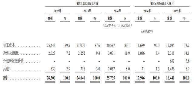 与销售及营销开支形成对比的是研发投入。报告期个期,其研发投入金额相对稳定,分别为2830.0万元、2404.0万元、2573.5万元,1644.1万元,分别为同期营销开支的17.92%、9.67%、6.81%、3.29%。其研发投入中,绝大多数为员工成本,2025年上半年,若羽臣产生63.2万元外包研发服务费。