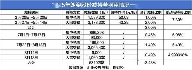 2025年5月22日,若羽臣公告,朗姿股份通过集中竞价和大宗交易分别减持258.93万股和317.83万股,分别套现7960.90万元、1.38亿元,合计减持比例3%,合计套现2.17亿元,持股比例从10.3%降至7.3%。