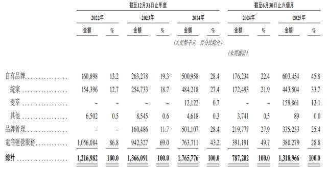 眼下,若羽臣自有品牌业务增长迅猛,已成为收入和利润增长的关键来源。2022年-2024年以及2025年上半年(简称:报告期)若羽臣营业收入分别为12.17亿元、13.66亿元、17.66亿元、13.19亿元,稳定增长。今年上半年,营业收入同比增长 67.55%,不过其收入构成发生明显变化。