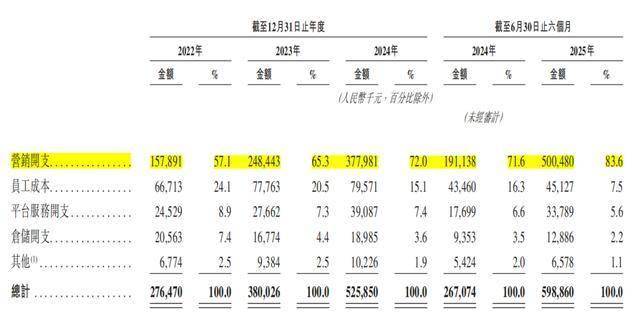 如果进一步拆分来看,2025年上半年其5.99亿元销售及营销开支中,营销开支占比达83.6%,约为5.00亿元。其营销开支主要主要指向两类核心用途:一是在天猫、抖音等多平台密集投放营销内容,获取流量、推广产品产生的费用,二是支付给合作KOL与KOC的佣金。