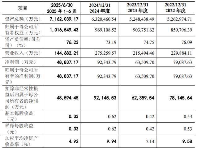 业绩方面,2022年至2024年及2025年上半年,公司营业收入分别为22.99亿元、21.55亿元、27.53亿元及14.47亿元,归属于母公司股东的净利润分别为7.91亿元、6.35亿元、9.23亿元及4.88亿元。
