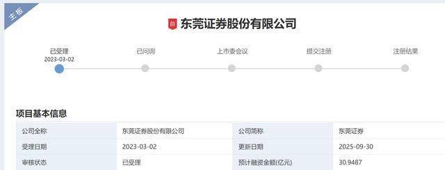 2015年1月,东莞证券辅导备案登记被正式受理;同年6月,中国证监会正式受理东莞证券IPO申报材料;2017年5月,东莞证券向证监会申请中止IPO审查;直至2021年2月,证监会才恢复对东莞证券IPO申请的审查;2022年2月24日,东莞证券首发过会,距离上市仅一步之遥,但因其暂缓提交IPO申请文件中记录的财务资料,审核中止。