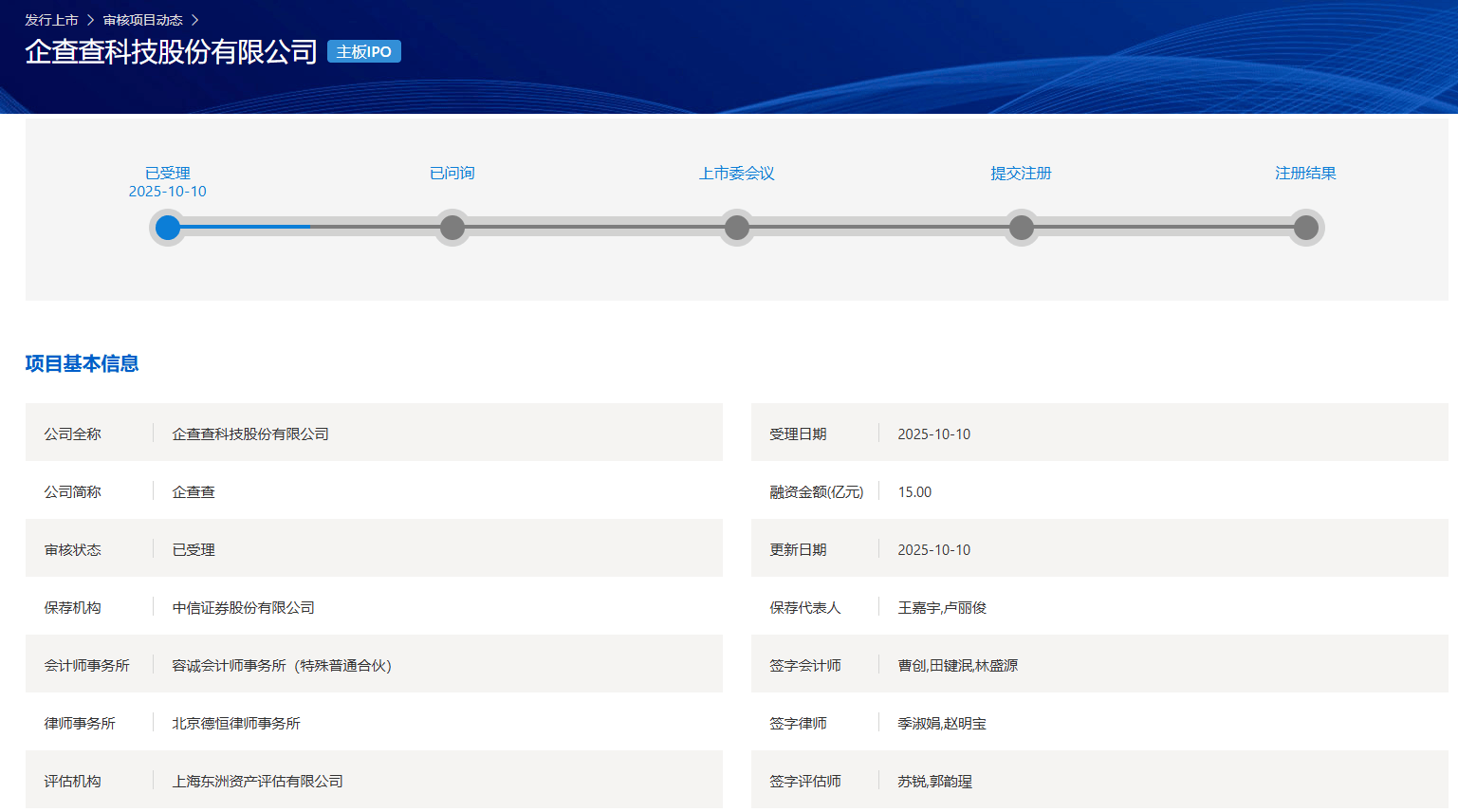 【大河财立方消息】10月10日,企查查科技股份有限公司A股上市材料获上交所受理。