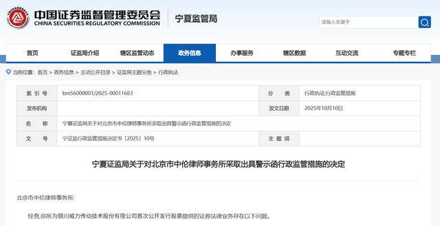 根据宁夏证监局在2025年10月10日发布的决定,北京市中伦律师事务所因其为威力传动(300904)首次公开发行股票提供的证券法律业务存在多项问题,受到出具警示函的行政监管措施。