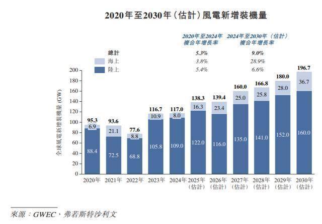 从新增装机量来看,全球风电在过去几年保持稳健增长。新增装机量从2020年的95.3GW增长至2024年的117.0GW,复合年增长率为5.3%。随著电力需求结构优化与大规模项目集中投产,预计到2030年新增装机量将进一步增至196.7GW,2024年至2030年的复合年增长率将提升至9.0%。