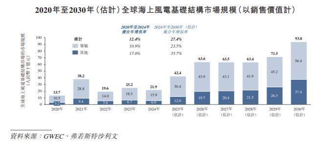 近年来,伴随全球能源转型加速及海上风电项目快速落地,海上风电基础结构市场呈现稳健增长。以销售价值计,全球海上风电基础结构市场从2020年的人民币137亿元稳步攀升至2024年的人民币219亿元,年复合增长率达12.4%。随著各国加速推进能源转型和海上风电项目落地,预计2024年至2030年市场将进入高速扩张期,年复合增长率大幅提升至27.4%,按此增速测算,到2030年,全球海上风电基础结构市场规模有望达到人民币938亿元,较2024年增长约4倍。这一快速增长主要受益于欧洲、中国等主要市场政策推动,以及在2030年碳减排目标压力下,各国政府加大对近深远海风电的技术与资源支持,推动相关开发进程持续加快。未来随著技术进步和规模效应显现,海上风电基础结构市场将持续扩容,为全球能源结构转型提供重要支撑。