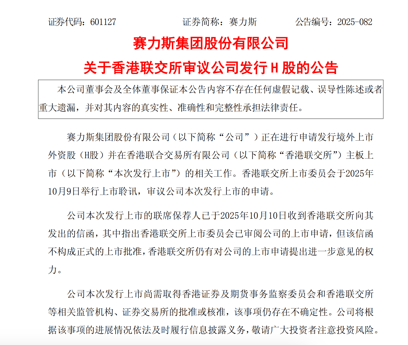 10月10日晚,赛力斯发布公告称,正在进行申请发行境外上市外资股(H股)并在香港联交所主板上市的相关工作。香港联交所上市委员会已于2025年10月9日举行上市聆讯,审议其本次发行上市的申请。
