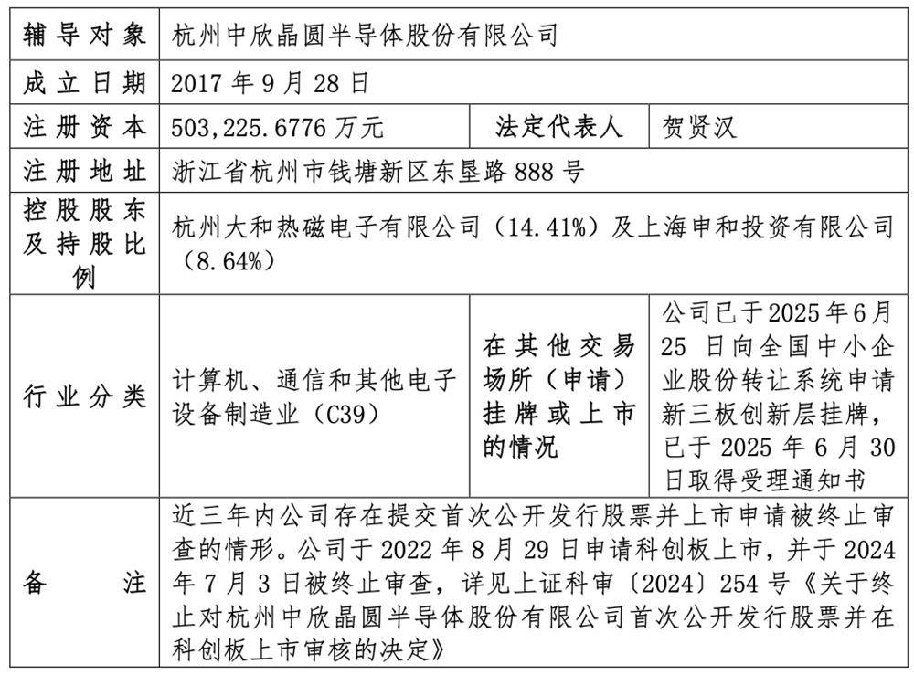 这家半导体硅晶圆企业已于2025年6月25日向全国中小企业股份转让系统申请新三板创新层挂牌,于2025年6月30日取得受理通知书。