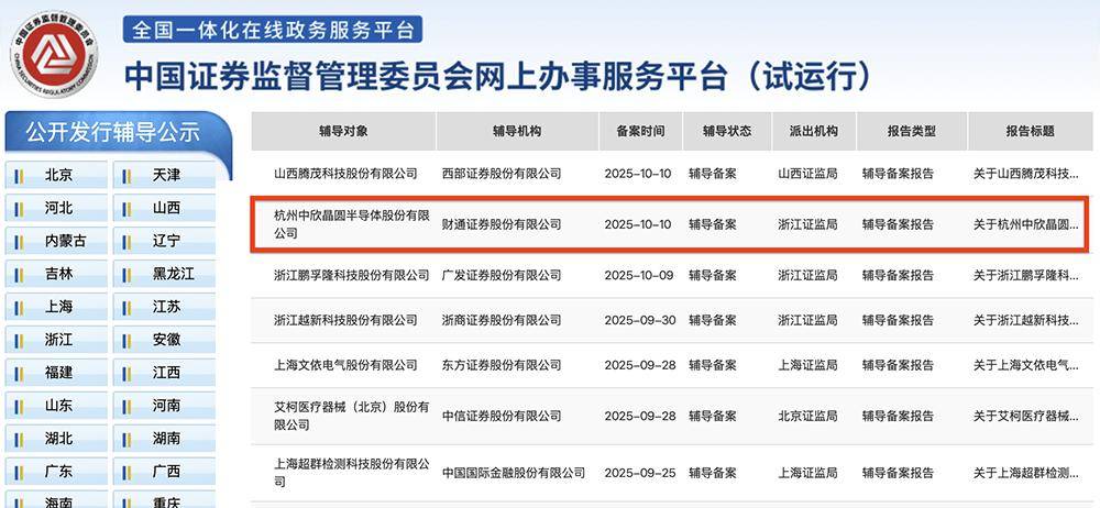 芯东西10月11日报道,10月10日,证监会官网披露,杭州半导体硅片龙头企业中欣晶圆在浙江证监局办理辅导备案登记,启动北交所IPO进程,辅导机构为财通证券。