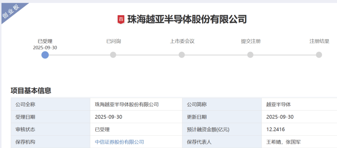 珠海越亚半导体申报创业板IPO于2025年9月30日获得受理,保荐机构为中信证券。公司本次IPO拟融资12.2416亿元。