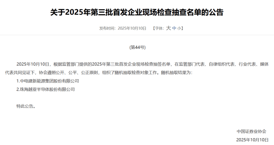 10月10日,中国证券业协会发布《关于2025年第三批首发企业现场检查抽查名单的公告》。中电建新能源集团股份有限公司、珠海越亚半导体股份有限公司两家IPO申报企业被抽中接受现场检查。