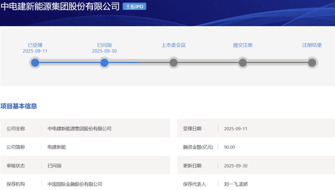 中电建新能源申报上交所主板IPO于2025年9月11日获得受理,保荐机构为中金公司。公司本次IPO拟募资90亿元。