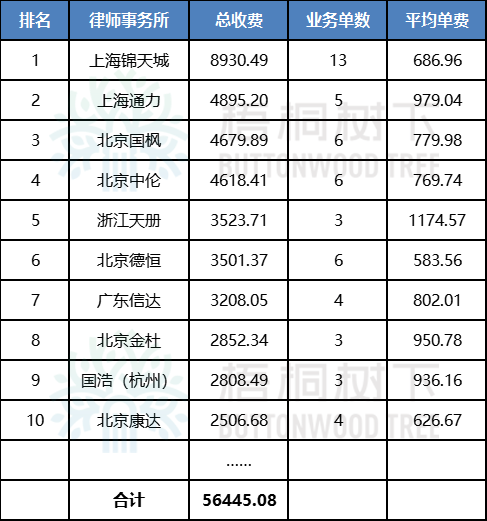 上海锦天城、上海通力、北京国枫、北京中伦、浙江天册、北京德恒、广东信达、北京金杜、国浩(杭州)、北京康达、北京海润天睿这11家律所的业务总收费超过2000万元;平均单笔业务收费在700万元以上的律所有9家;平均单费低于500万的律所有6家;总收费排名前十的律所中,浙江天册的平均单费最高,为1174.57万元,业务单数有3单。
