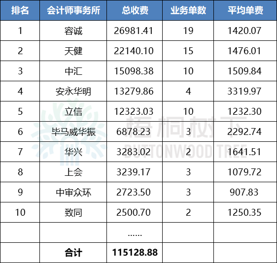 容诚、天健、中汇、安永华明、立信这5家会计师事务所的业务总收费超过1亿元;平均单笔业务收费在1000万元以上的会所有12家;平均单费低于800万的会所有2家;总收费排名前十的会所中,安永华明的平均单费最高,为3319.97万元,业务单数有4单。