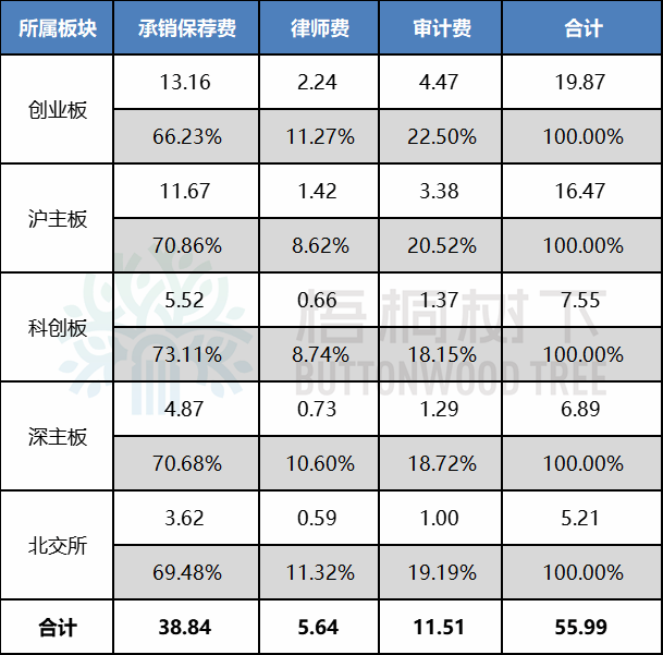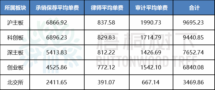 承销保荐费平均单费最高的板块为科创板,6896.23万元,最低为北交所,平均单费2411.65万元;律师费平均单费最高的板块为沪主板,837.58万元,最低为北交所,平均单费391.07 万元;审计费平均单费最高的板块为沪主板,1990.73万元,最低为北交所,平均单费667.14万元。