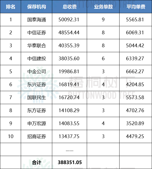 国泰海通、中信证券、华泰联合、中信建投、中金公司、东兴证券、国联民生、东方证券、申万宏源、招商证券、天风证券、国金证券这12家券商的业务总收费超过1亿元;平均单笔业务收费在5000万元以上的券商共有11家;平均单费低于3000万的券商有5家;总收费排名前十的券商中,中金公司的平均单笔业务收费最高,为6662.27万元,业务单数有3单。