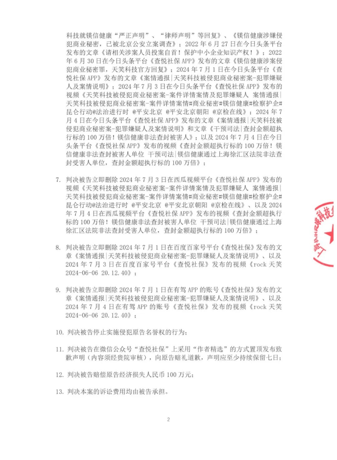 面对指控,镁信健康于2022年6月16日发布声明否认全部指责,称天笑科技的言论为“捏造并散布不实信息”,公司已就涉嫌诽谤及损害商业信誉行为向公安机关提起控告。随后,镁信健康还通过其委托律师发布律师函,要求天笑科技撤回相关内容并公开道歉。