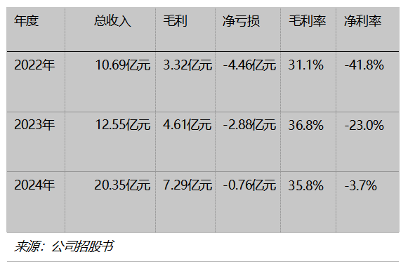 据招股书,2022年至2024年,公司总收入分别为人民币10.69亿元、12.55亿元和20.35亿元,三年复合增长率约38%。同期净亏损呈逐年收窄趋势,分别为人民币4.46亿元、2.88亿元和0.76亿元,三年合计亏损额仍超过8亿元。