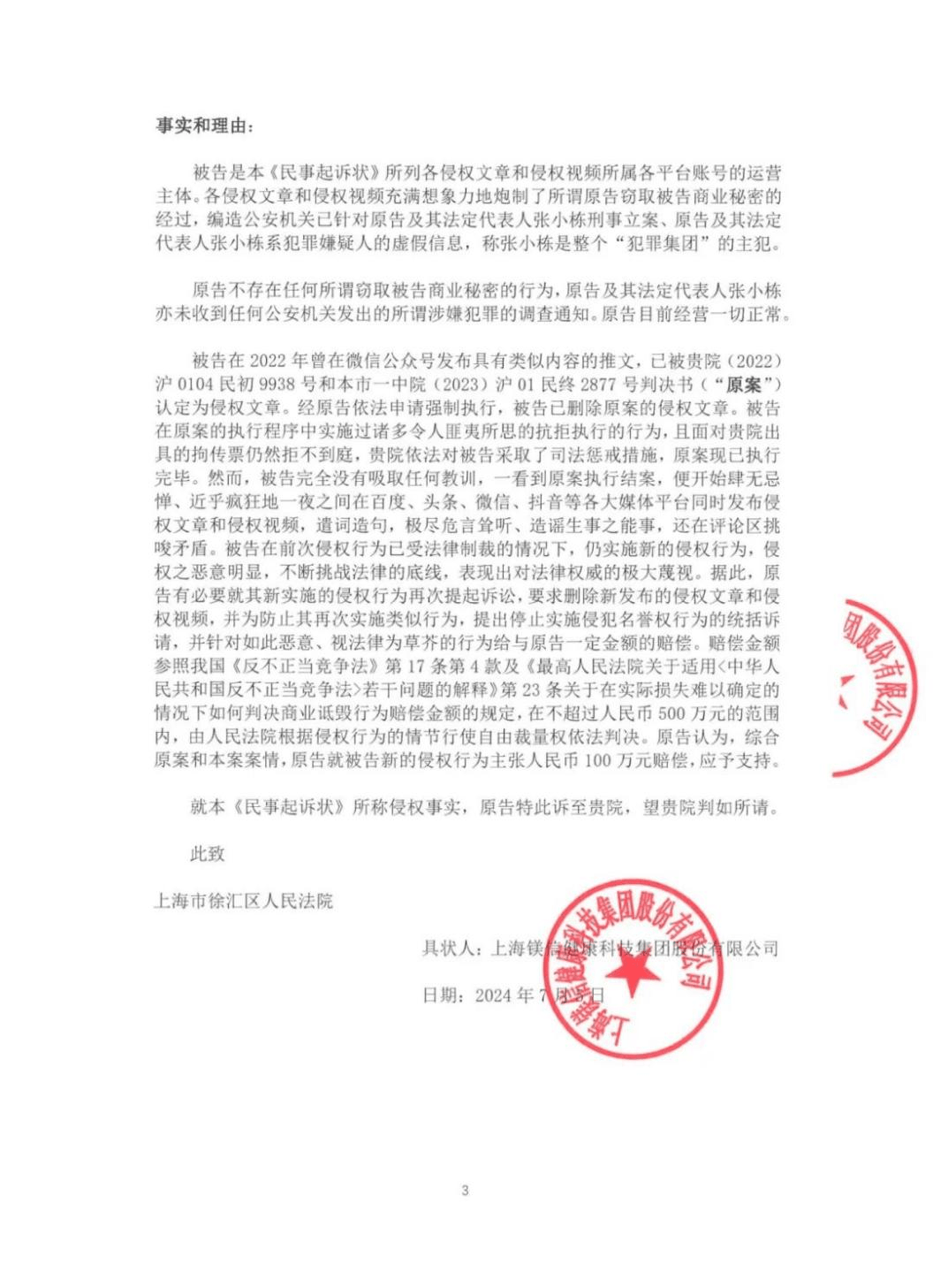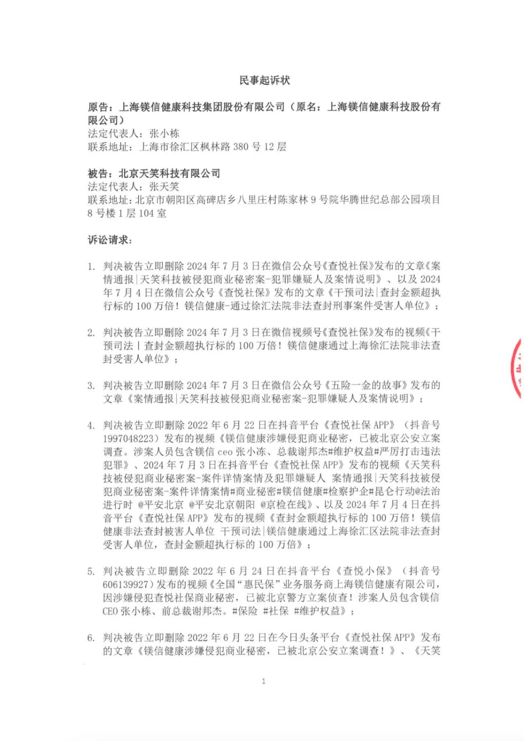 此外,“查悦社保”微信公众号披露的民事起诉材料显示,镁信健康已就相关言论向法院提起名誉权纠纷诉讼,并于2024年8月6日申请诉中财产保全,法院已冻结天笑科技对公账户人民币100万元。诉讼中所列争议内容包括2022年及2024年间天笑科技发布的多篇文章标题,涉及对镁信健康涉嫌侵犯商业秘密、干预司法等指控。该民事案件目前正由法院受理,仍在审理阶段。