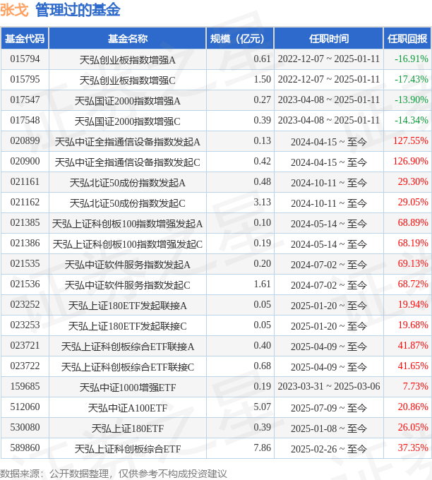张戈先生:管理科学与工程专业博士。历任建信基金管理有限责任公司研究员、投资经理,大家保险资产管理公司投资经理。2022年9月加盟天弘基金管理有限公司。历任天弘创业板指数增强型证券投资基金基金经理(2022年12月至2025年01月)、天弘国证2000指数增强型证券投资基金基金经理(2023年04月至2025年01月)、天弘中证1000增强策略交易型开放式指数证券投资基金基金经理(2023年03月至2025年03月)、天弘上证180指数型发起式证券投资基金基金经理(2025年01月至2025年02月)。现任天弘基金管理有限公司基金经理、基金经理助理。天弘中证全指通信设备指数型发起式证券投资基金基金经理、天弘上证科创板100指数增强型发起式证券投资基金基金经理、天弘中证软件服务指数型发起式证券投资基金基金经理、天弘北证50成份指数型发起式证券投资基金基金经理、天弘上证180交易型开放式指数证券投资基金基金经理、天弘上证科创板综合交易型开放式指数证券投资基金基金经理、天弘上证180交易型开放式指数证券投资基金发起式联接基金基金经理、天弘上证科创板综合交易型开放式指数证券投资基金联接基金基金经理。
